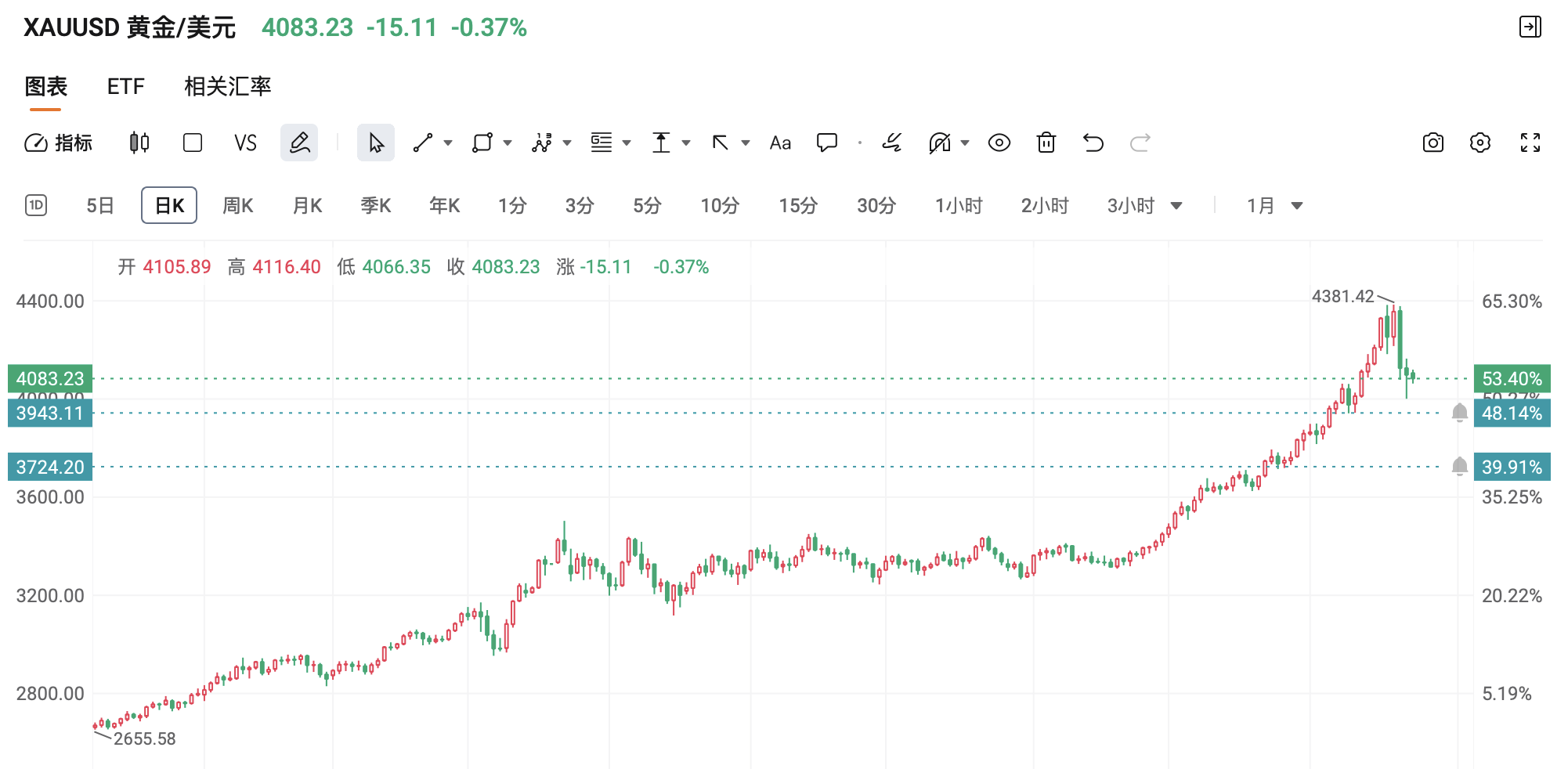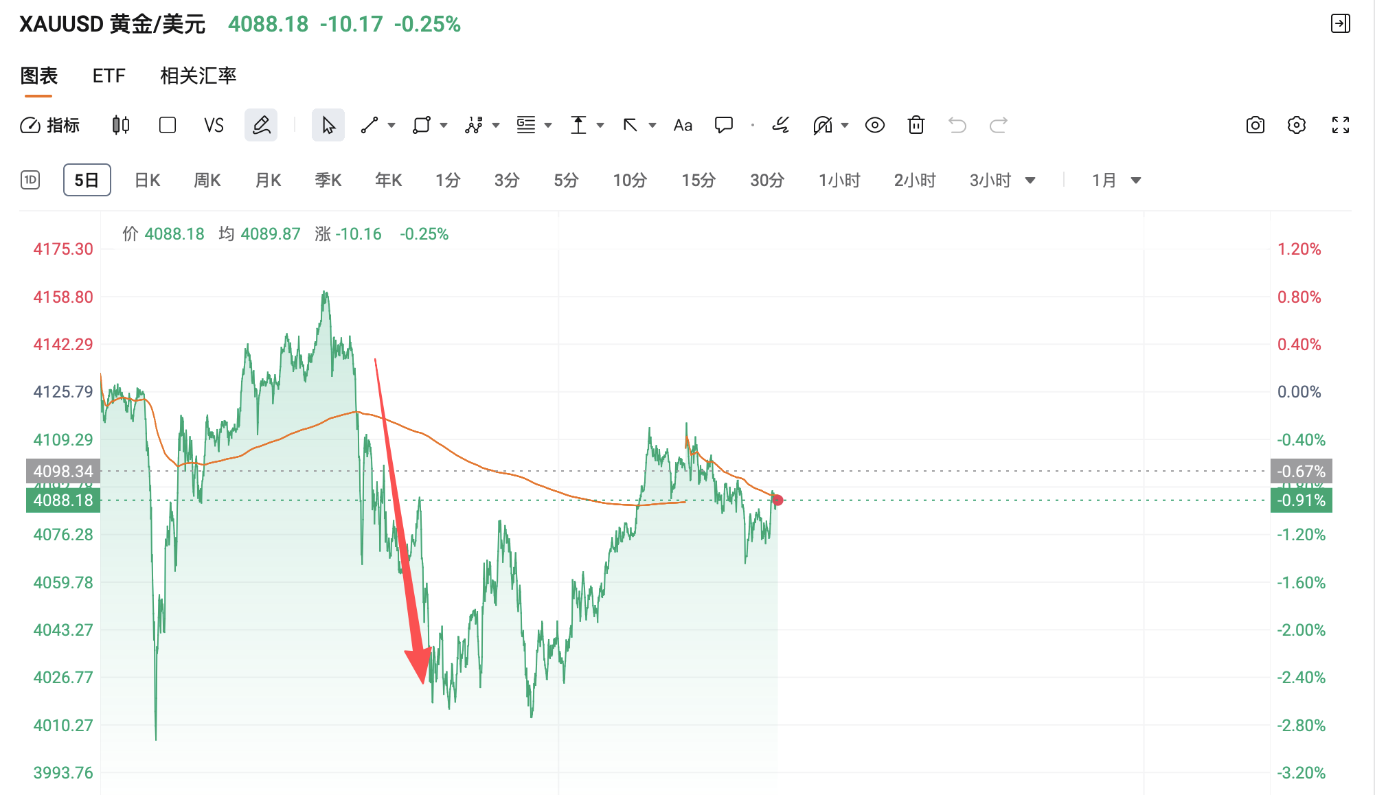 黄金现货价格在昨天16:00之后重新开始回落,盘中再度逼近4000美金