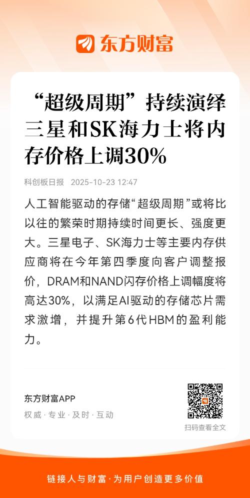 人工智能驱动的存储“超级周期”或将比以往的繁荣时期持续时间更长、强度更大。三星电子、SK海力士等主要内存供应商将在今年第四季度向客户调整报价,DRAM和NAND闪存价格上调幅度将高达30%,以满足AI驱动的存储芯片需求激增,并提升第6代HBM的盈利能力。 (韩国经济日报)