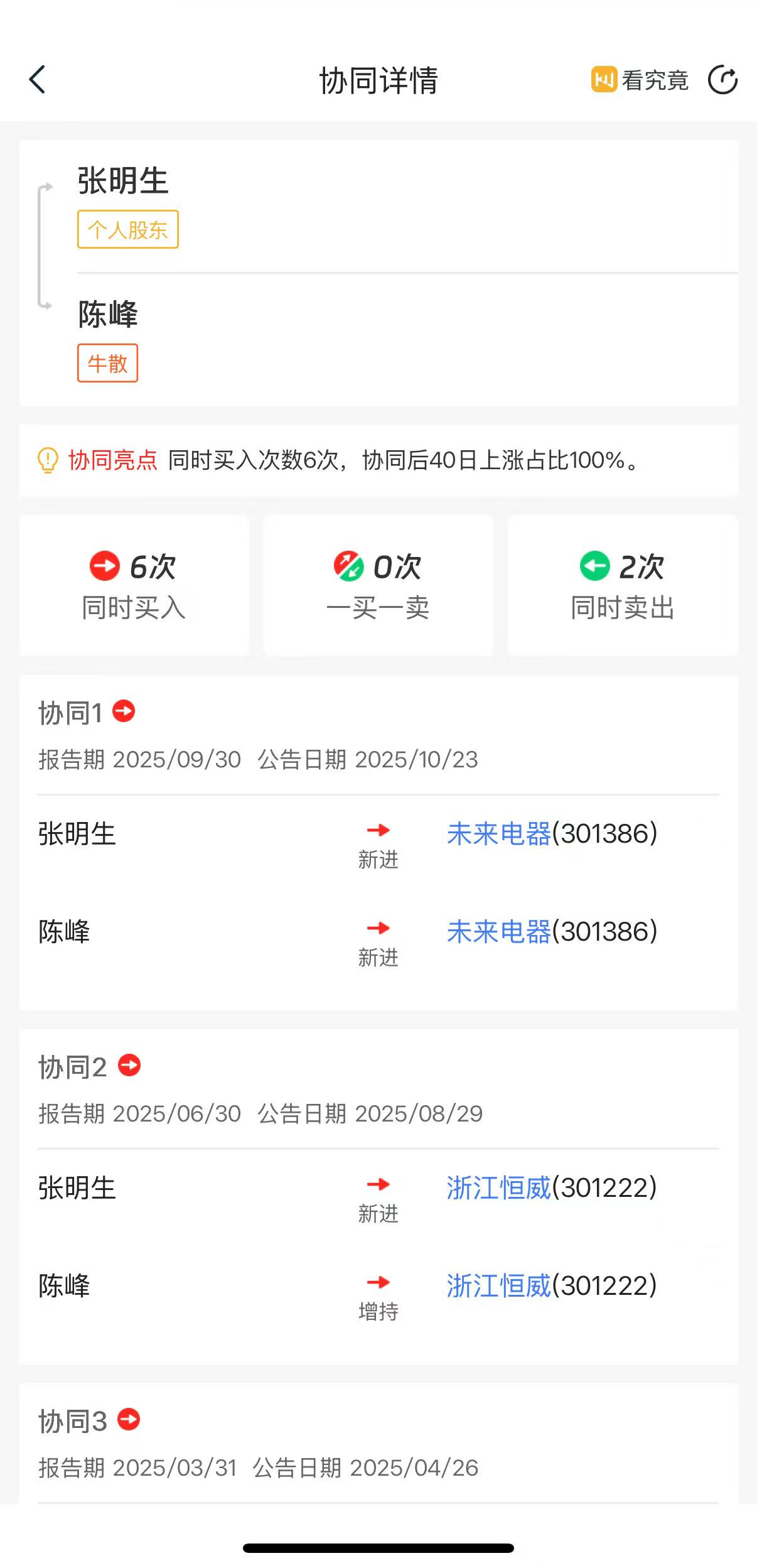 牛散陈峰最近和个人股东张明生操作有点高度雷同,发生6次同买操作,离谱的是每次买入