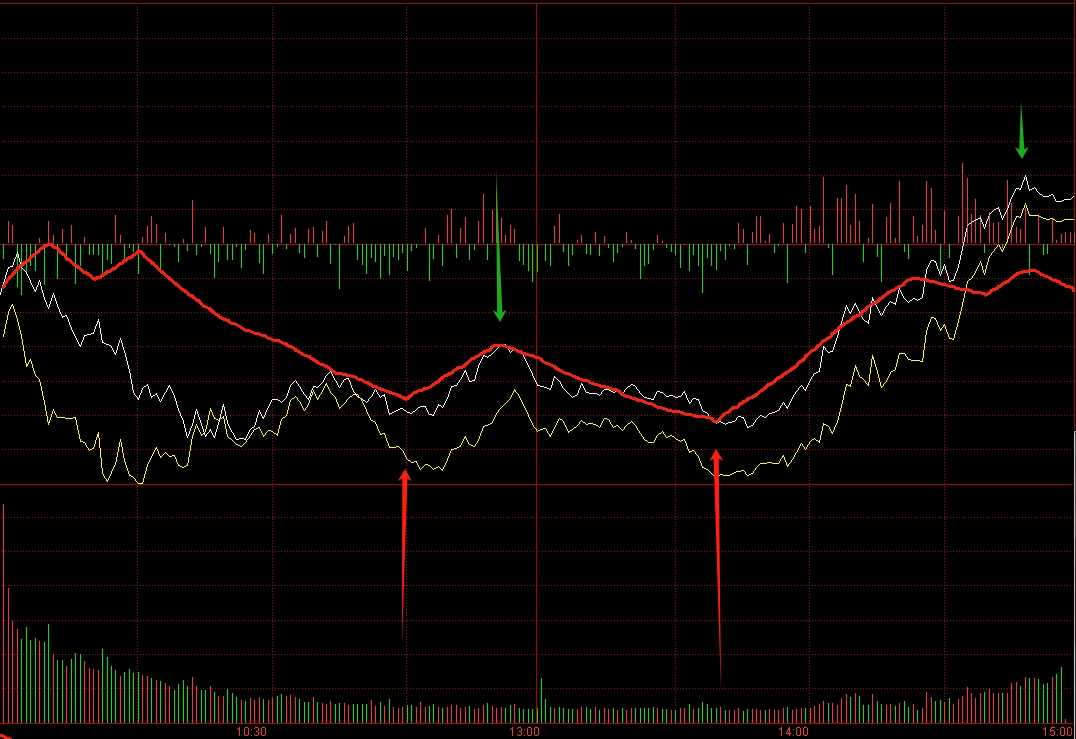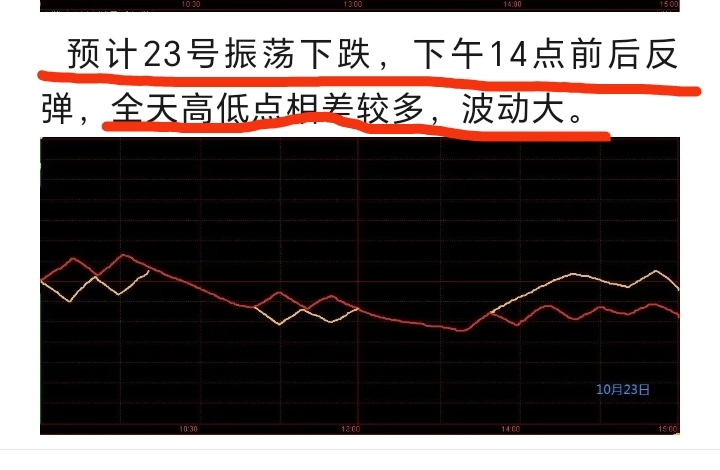 主要高低点时间也都精准符合(底下有时间坐标),震荡下跌到13点40分开始反弹,跟预测图反弹时间一样。