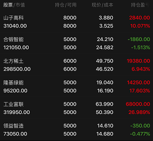 三红三绿,账户整体微盈。合锻智能的强势和隆基的止跌是今天最大的安慰,但山子高科的持续探底也确实让人揪心。