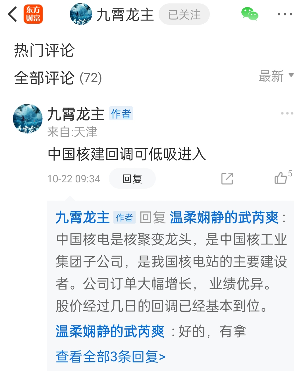 中国核电今日表现特别给力,上午调整一下快速拉升涨停。如果涨慢一点还准备高位减持一点,没给机会。核建是核聚变龙头,是中国核工业集团子公司。是央企,自带各种姿源、技术优势。他是我国核电站的主要建设者,华龙一号也是中国核建参与建设的。是全球唯一连续40年不间断核电建造企业,龙头低位稳固。他也是未来核聚变电站的主要参与者,有丰富的想象空间。公司订单大幅增长,近几年业绩优秀且稳步增长。前几日的回调周二已经基本到位,昨日上午在低位就做了一些低吸。