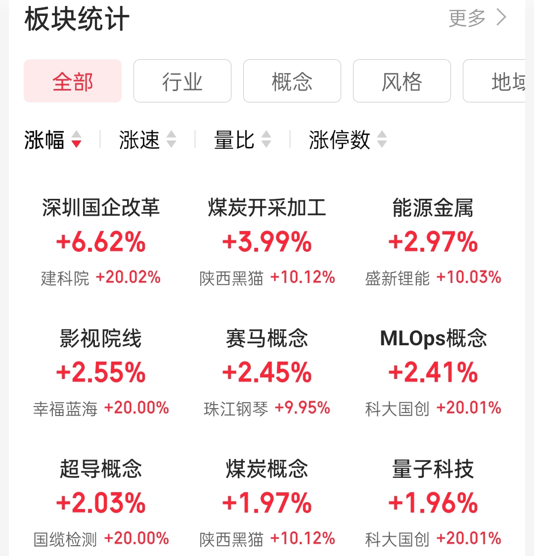 在板块方面,今日深圳帼企改革、煤炭开采加工、能源金属、影视院线、赛马概念、MLOps概念等几个板块表现的比较积极,涨幅靠前。从板块表现看,板块轮动依旧较快,目前板块表现活跃的大多是仍是前期滞胀板块。市场风格已变,目前不再是科技股天下。