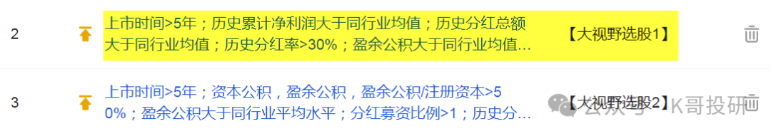 在明确了好生意的标准之后,接下来我们聊聊在选股层面,具体该怎么操作。我的做法是把上述活得久、赚得多、分的多的生意模式,通过几个财报指标,转换为一条量化选股策略,我给这条选股策略起了个名字叫作:大视野选股策略,也叫好生意选股策略,如下图所示。