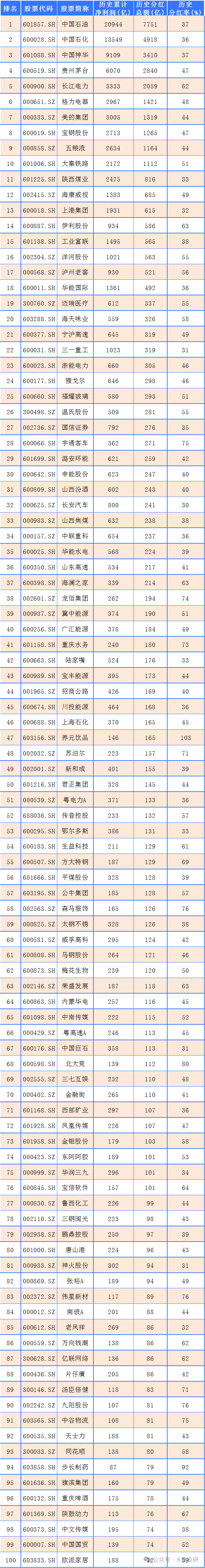 笔者在执行上述选股策略后,按照历史分红总额从高到低排列,选出了最适合长期持有的100只股票。这里要解释下为何单单基于历史分红总额排名,而不是按照其他指标排名?