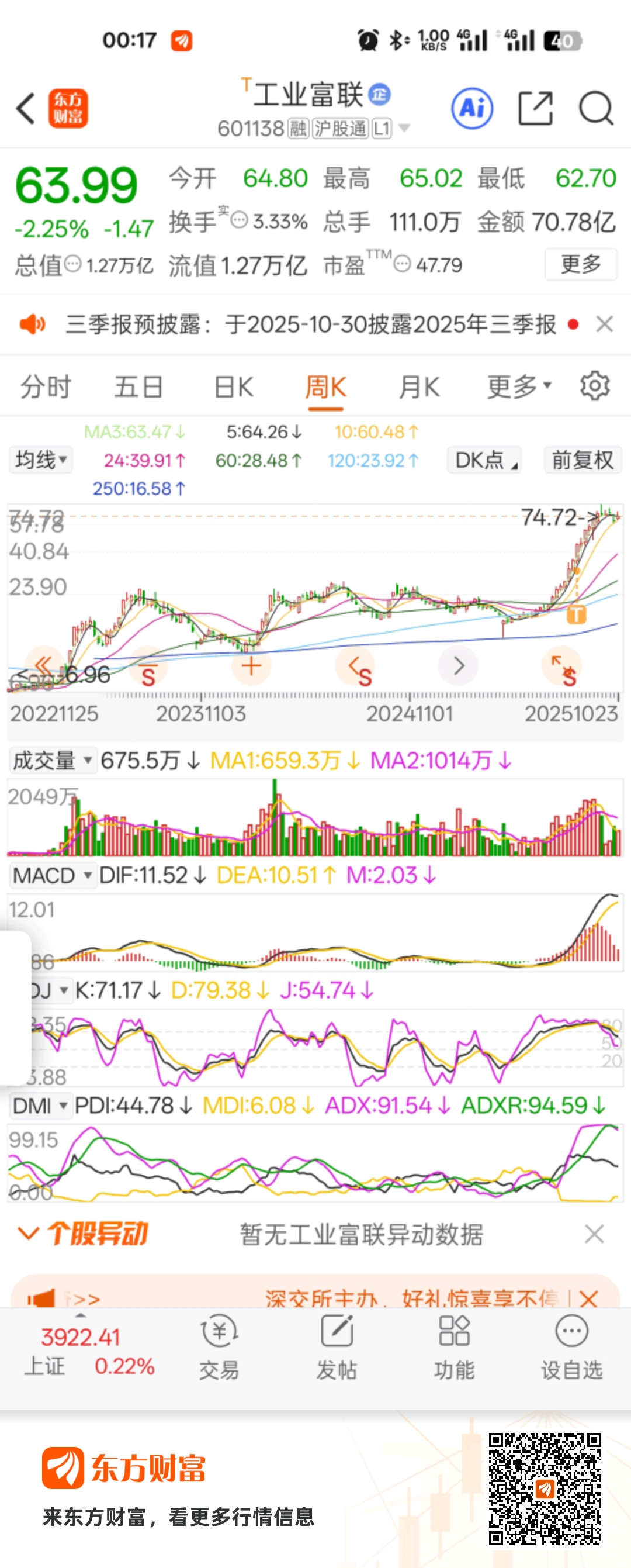 #炒股日记# 周线5周的成交量均线调头,KDJ死叉,头部也出来了