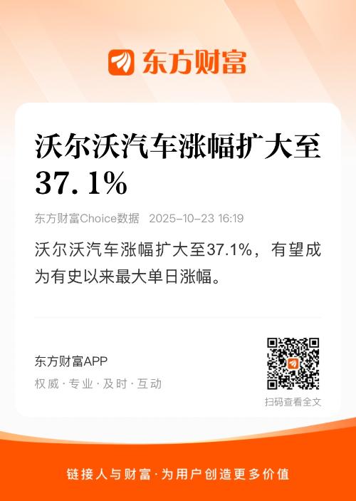 沃尔沃汽车涨幅扩大至37.1%,有望成为有史以来最大单日涨幅。