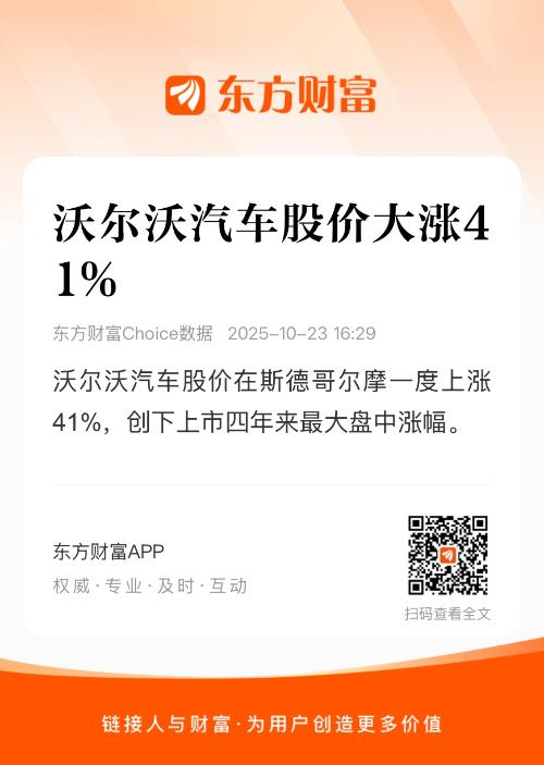 沃尔沃汽车股价在斯德哥尔摩一度上涨41%,创下上市四年来最大盘中涨幅。