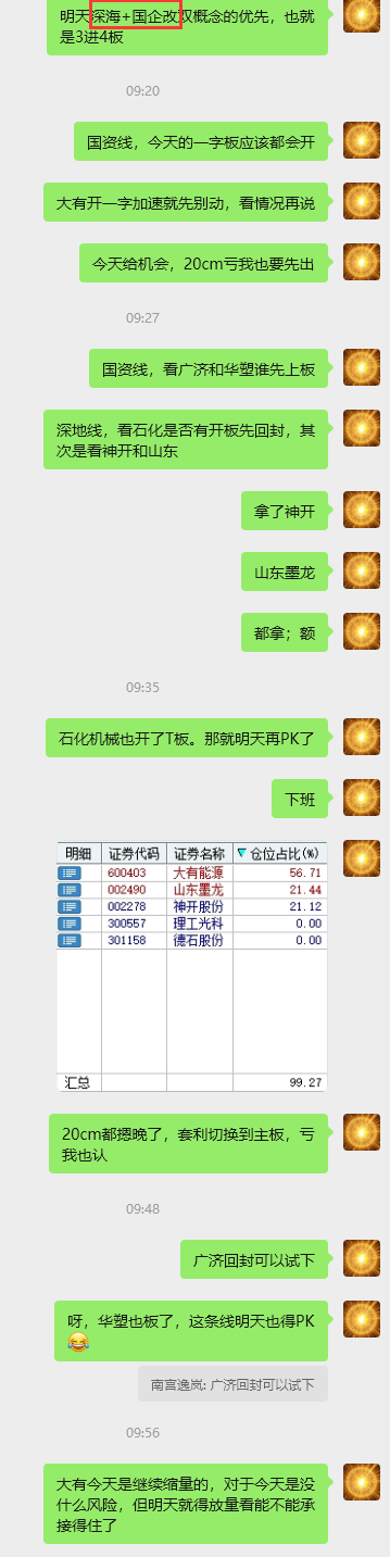 回归了纯短线情绪博弈,下班也早了,因为短线行就是行,不行就是不行,基本上10点前结果就出来了,除非当天的市场很差才会拖到下午出结果;明天才是真正考验大有的放量承接的成色,同时也是低位深地和国资的龙头PK成果,对于今天而已,有机会做PK的,今天的运气不错,说的几个标的都板了,具体明天再看了