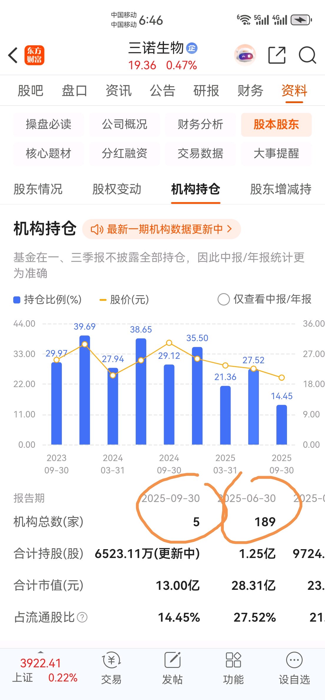 三诺生物2025年10月24日在三季度报告中披露,截至2025年9月30日公司股东户数为2.46万户,较上期(2025年6月30日)增加9080户,增幅达58.52%。机构都快跑光了,2025.6.30 机构189家,2025.9.30 就只剩5家!机构6.30合计持股1.25亿股,9.30就只6523.11万股了!合计市值从28.31亿仅仅剩下13亿!占流通股比从27.52%降为14.45%,估计9.30到此时此刻己经跑光了!三诺生物股东户数增加58.52%,户均持股36.57万元!散户数量增加太多了,把机构都赶跑了