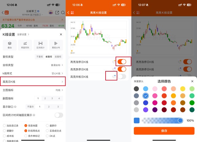 1)点击k线设置-高亮日K线-选择要开启高亮的类型-点击开启/关闭