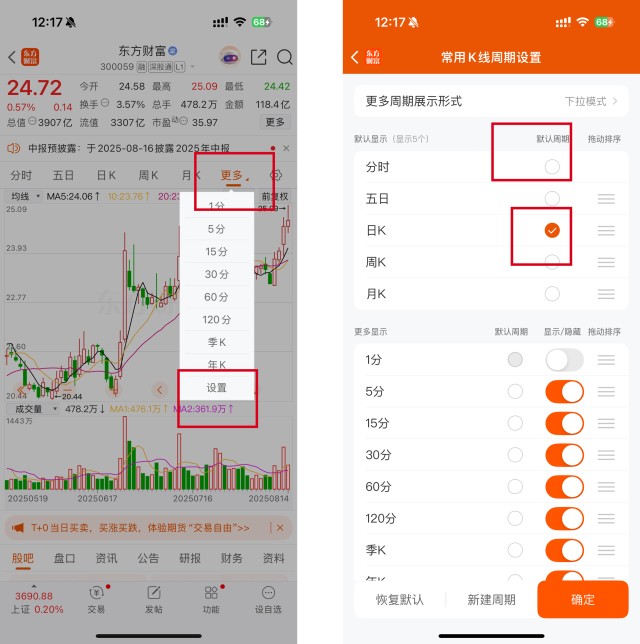 打开更多周期-下拉菜单找到【设置】-勾选默认周期,比如您想默认看日k,就选择日K-点击【确认】后生效