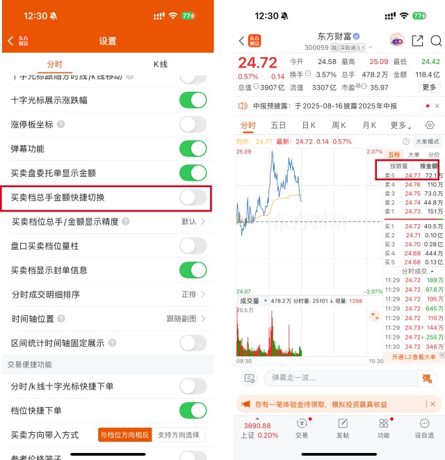 点击【分时设置】→进入【全部分时设置】- 找到【买卖档总手金额快捷切换】开关,打开开关,便捷切换就会显示在买卖档了。