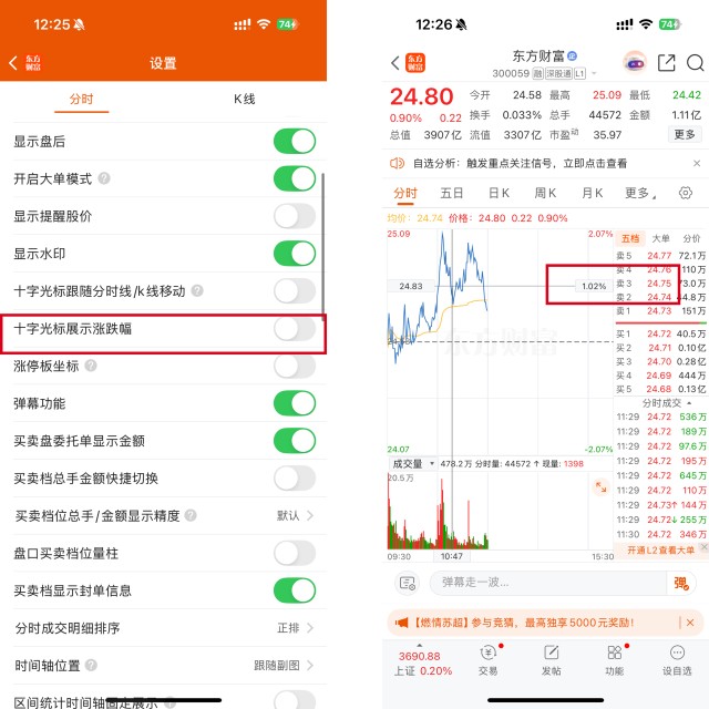 分时设置-全部分时设置-十字光标展示涨跌幅-设置开启后,在分时界面长按激活十字光标,拖动光标中心,涨跌幅信息实时显示在光标旁了