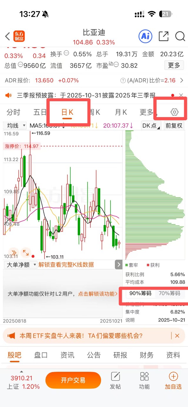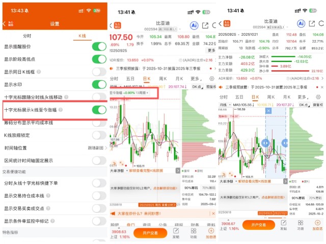 东方财富app通过个性化界面定制,全新升级看盘体验,推出多项智能优化,用户可自由锁定K线周期、量额切换让资金动向一目了然,打造专属看盘视图,从多角度呈现市场全貌,让分析更直观,决策更高效。