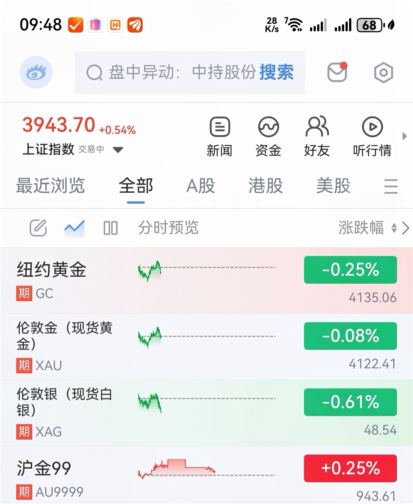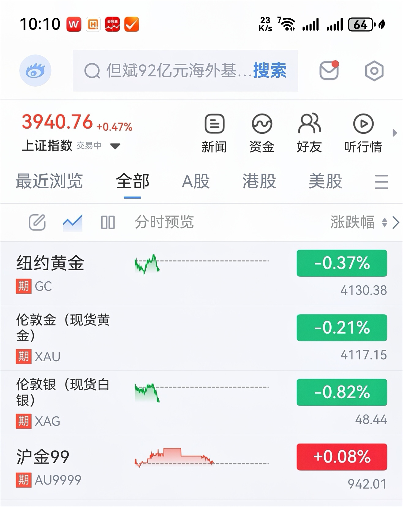 观察黄金999指数涨幅,在后来也陆续跳水回落下来变微涨+0.08%了。