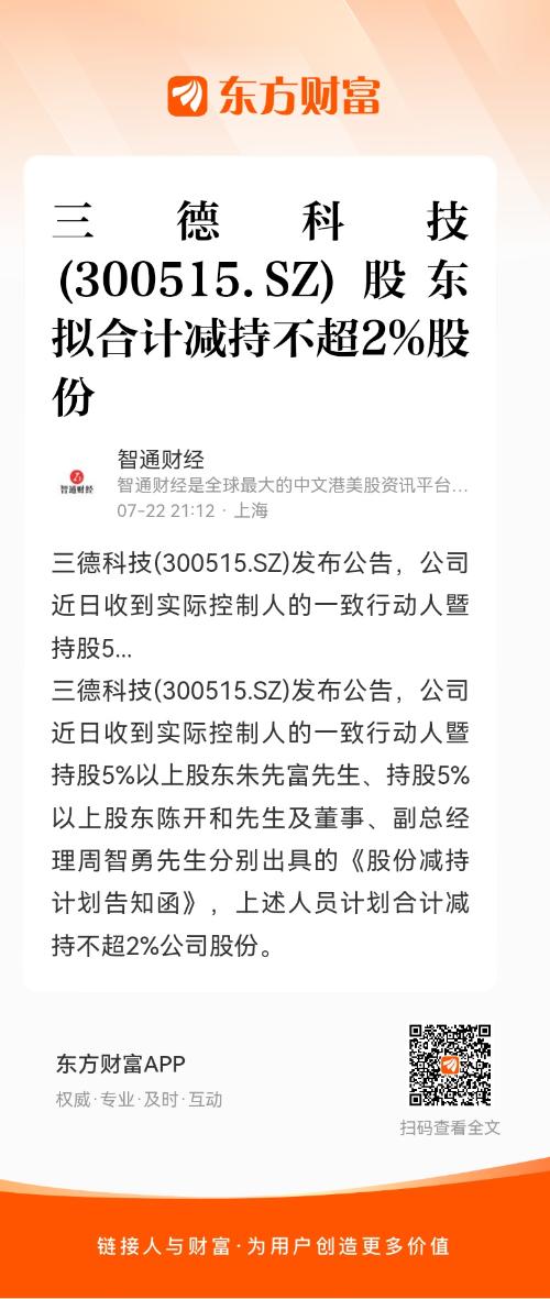 三德科技(300515.SZ)发布公告,公司近日收到实际控制人的一致行动人暨持股5%以上股东朱先富先生、持股5%以上股东陈开和先生及董事、副总经理周智勇先生分别出具的《股份减持计划告知函》,上述人员计划合计减持不超2%公司股份。