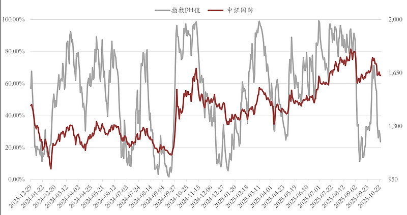 中证国防指数成交额进一步萎缩至215亿,带动情绪指标进一步下行至23%左右,非常接近20%的高性价比区域。