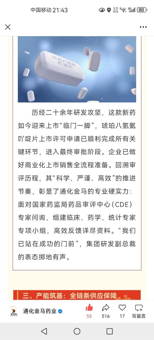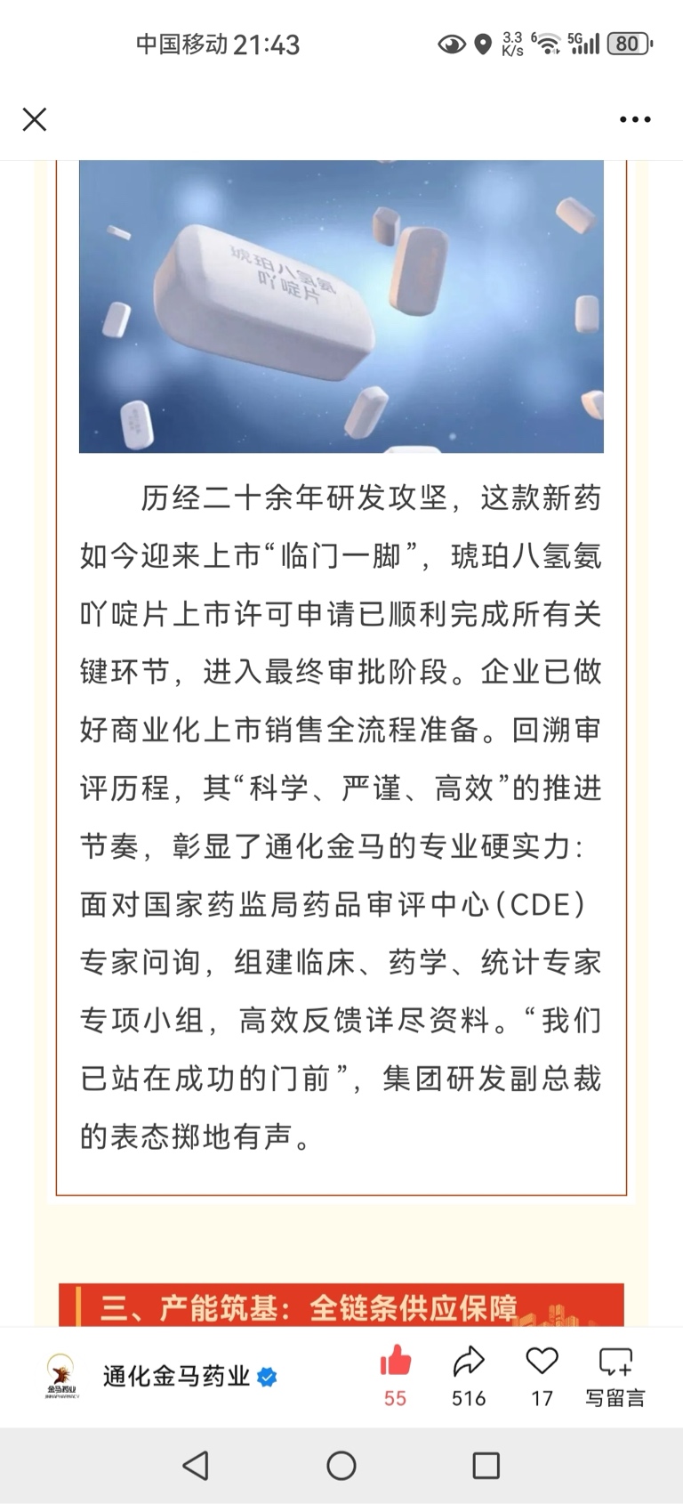 您好,目前我公司新药已完成各项专业审评工作,进入综合审评环节,临近审批阶段。公司新药琥珀八氢氨吖啶片审评进展请以药审中心公示信息为准,如公司发生达到信息披露标准的事项,公司将根据相关信息披露的规定和要求予以披露。