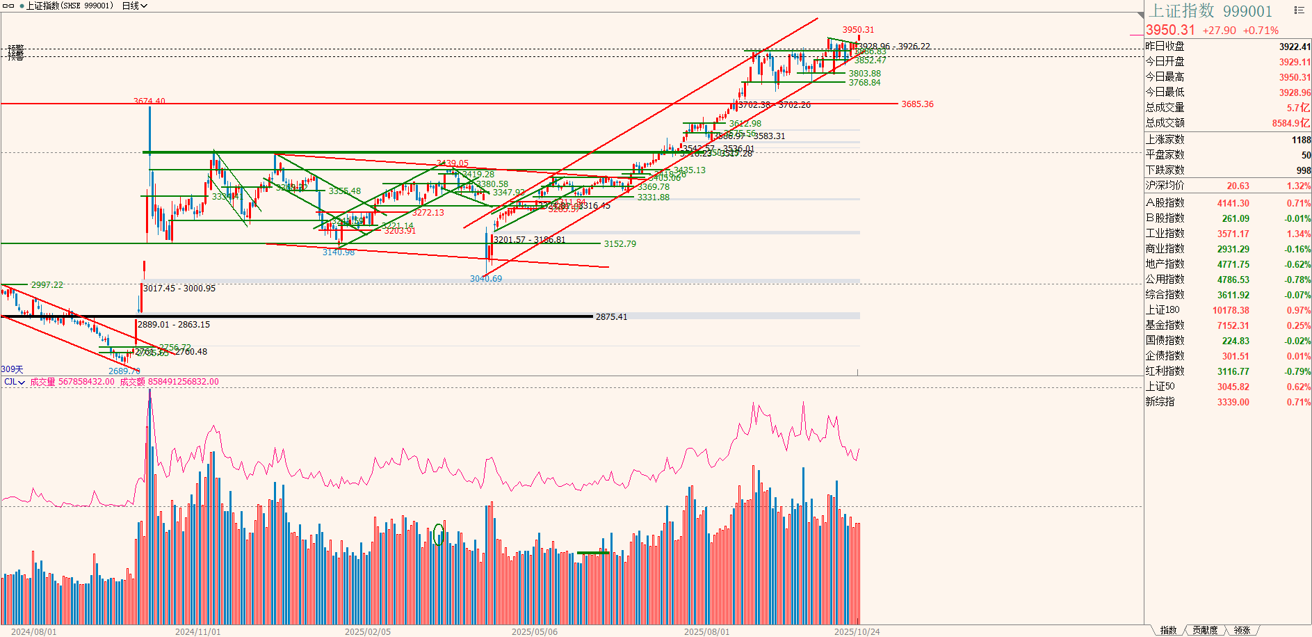1024期大盘高开高走,突破了旗型整理,收光头小阳线,继续按照上升通道的主升浪来