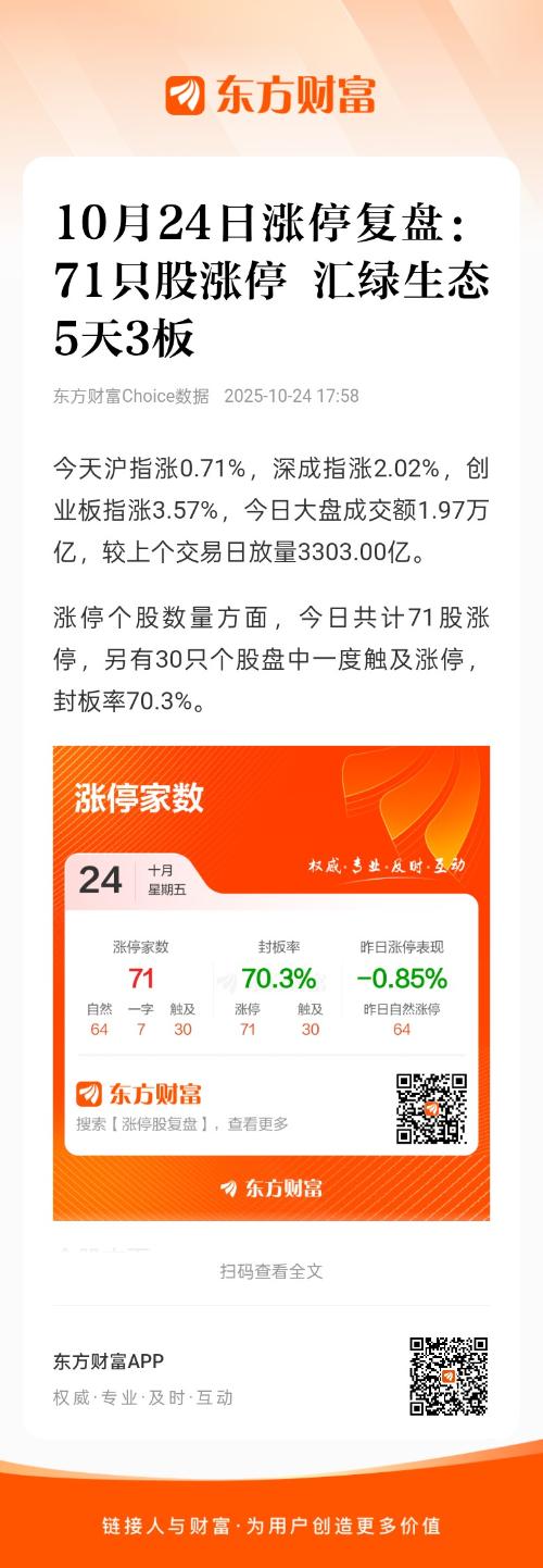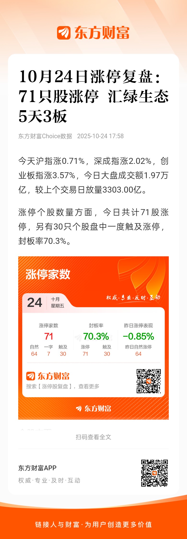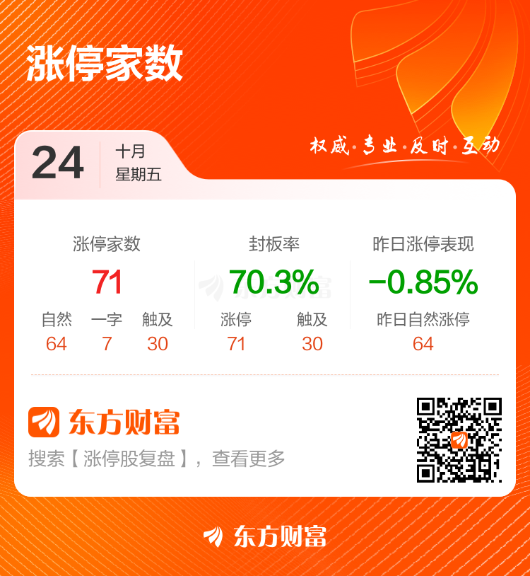 涨停个股数量方面,今日共计71股涨停,另有30只个股盘中一度触及涨停,封板率70.3%。