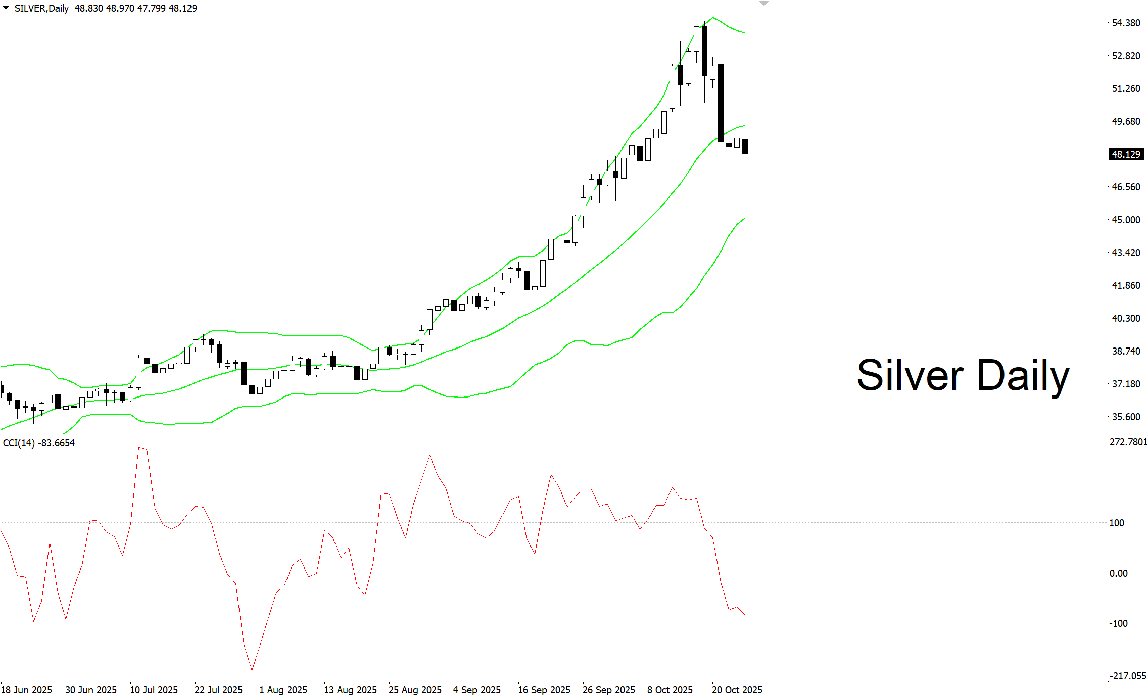 昨日银价回升受制于布林上轨的阻力,日内弱势回调,目前布林开口正加速收窄,CCI在-70附近一度走平后再次加速下行,因此预计后市银价将在47.80-48.75的区间波动,如突破区间上方看49.40/50.30,如跌破下方看47.30/47.00。
