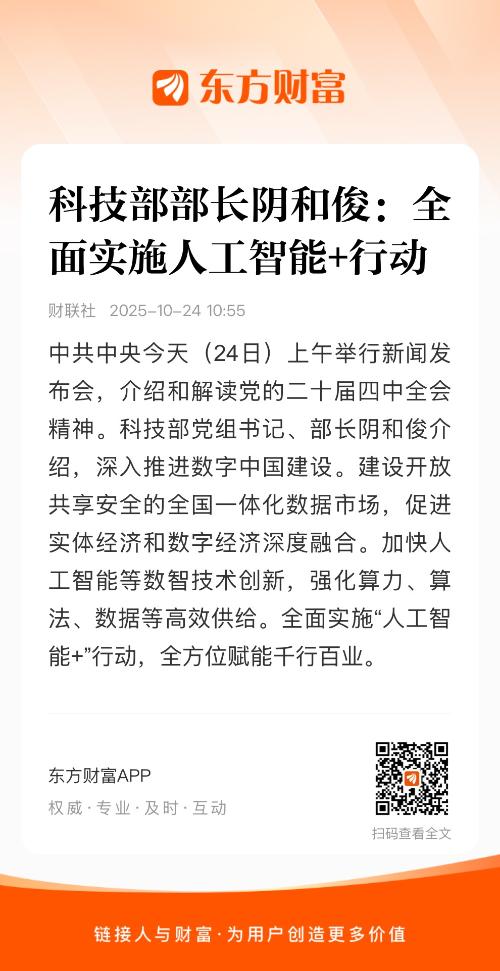 中共中央今天(24日)上午举行新闻发布会,介绍和解读党的二十届四中全会精神。科技部党组书记、部长阴和俊介绍,深入推进数字中国建设。建设开放共享安全的全国一体化数据市场,促进实体经济和数字经济深度融合。加快人工智能等数智技术创新,强化算力、算法、数据等高效供给。全面实施“人工智能+”行动,全方位赋能千行百业。