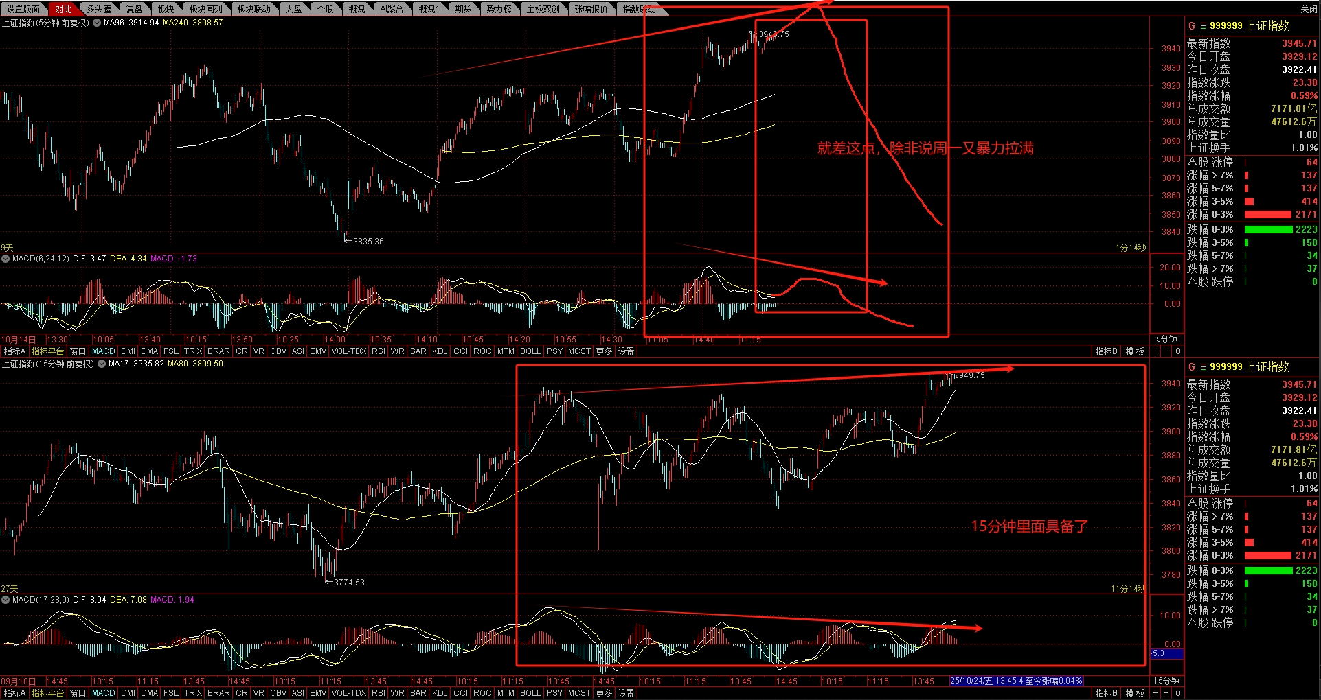 周一可能从高回落,目前五分钟的顶背离只差指数新高、macd次新高。