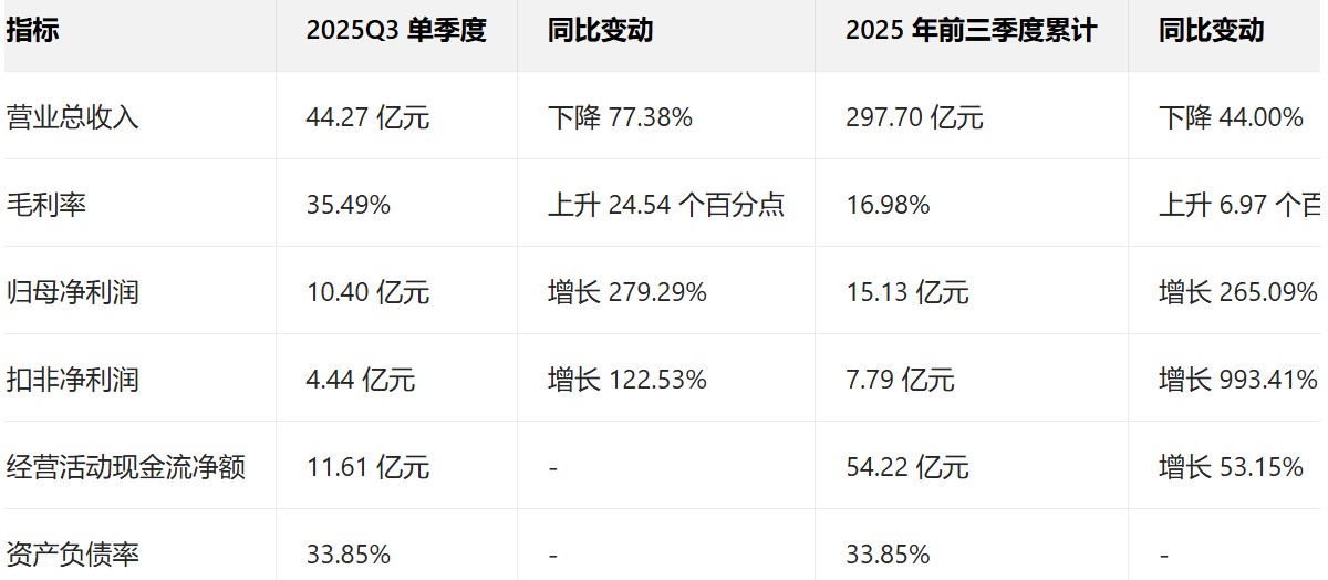 毛利率上去了,利润自然就涨了。2025Q3 归母净利润 10.40 亿元,同比增长 279.29%,看起来像是 "大赚特赚"。但这里必须拆清楚:这些利润里,有多少是 "一次性的快钱",有多少是 "主业能持续赚的钱"?毕竟靠卖资产赚的钱,明年可能就没了;靠主业赚的钱,才是真本事。