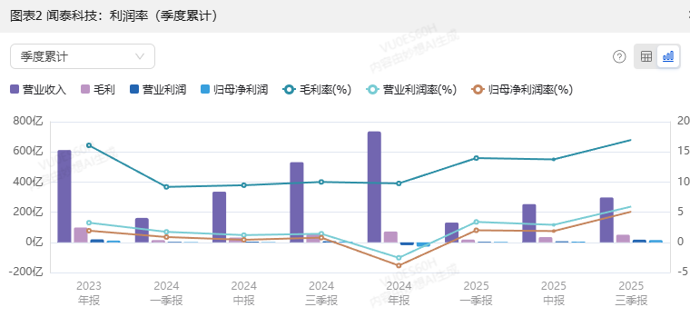 如果说营收暴跌是 "表象",那毛利率暴涨就是这张财报的 "内核"。2025Q3 毛利率达到 35.49%,比去年同期的 10.95%(35.49%-24.54%)足足涨了 24 个百分点,相当于以前卖 100 块货赚 10 块,现在能赚 35 块,赚钱效率直接翻了三倍多。这才是闻泰真正的 "翻身仗"。