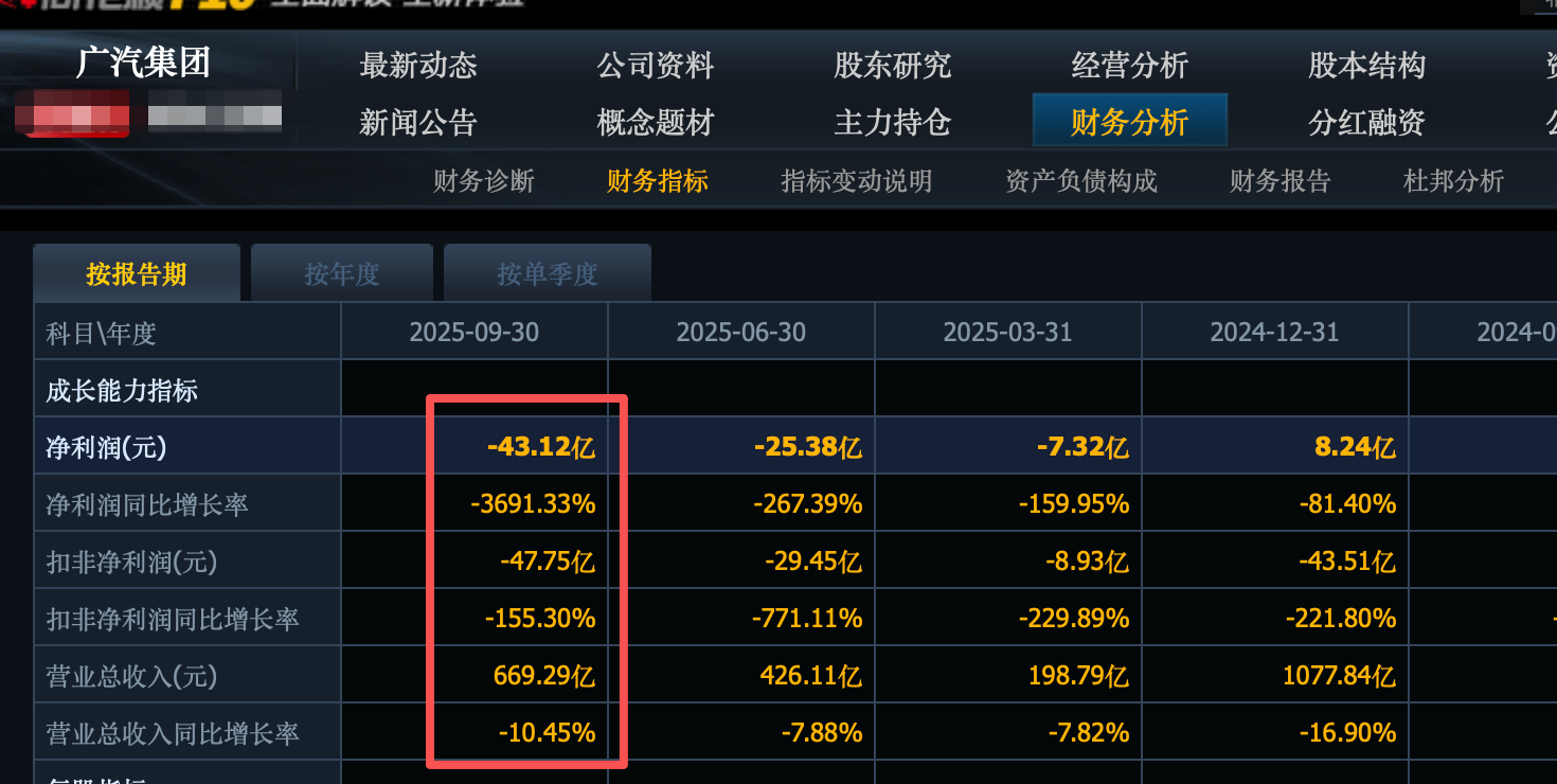 广汽集团前三季度亏损扩大到43亿元。公司亏损是核心是销量与利润支柱双重承压:2025 年前三季度整体销量同比降 11.34%,广本、传祺、埃安等主力品牌下滑明显,仅广丰微增;合资品牌收入降幅超 27%,联营投资收益从 83 亿跌至 30 亿,失去利润支撑。