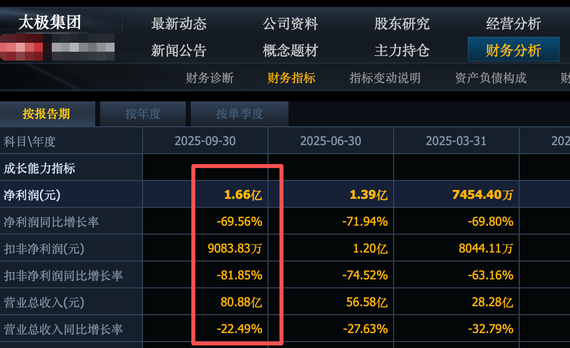 太极集团今年前三季度公司的收入下滑22%到81亿,净利润下滑70%到1.66亿。