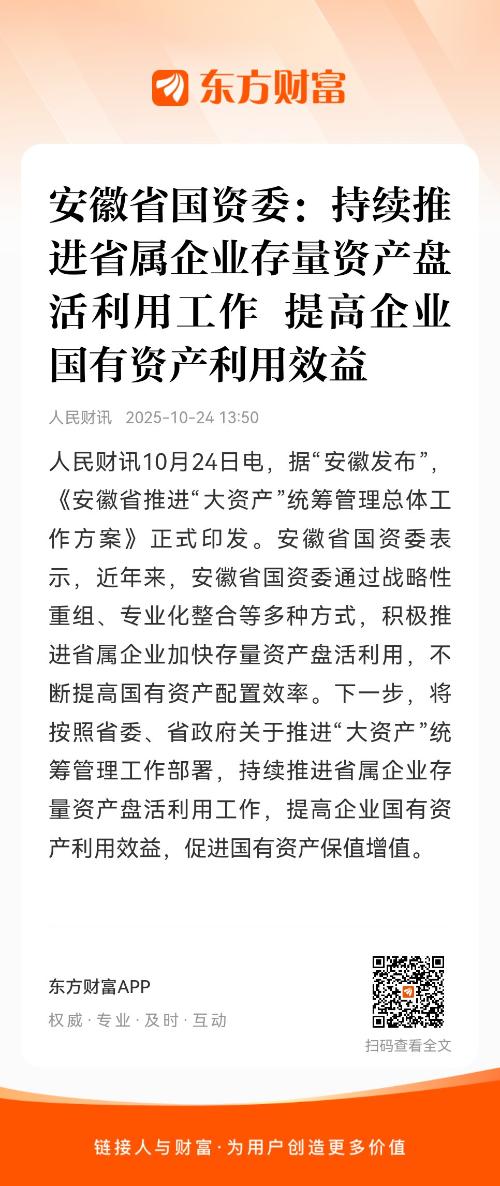 人民财讯10月24日电,据“安徽发布”,《安徽省推进“大资产”统筹管理总体工作方案》正式印发。安徽省国资委表示,近年来,安徽省国资委通过战略性重组、专业化整合等多种方式,积极推进省属企业加快存量资产盘活利用,不断提高国有资产配置效率。下一步,将按照省委、省政府关于推进“大资产”统筹管理工作部署,持续推进省属企业存量资产盘活利用工作,提高企业国有资产利用效益,促进国有资产保值增值。