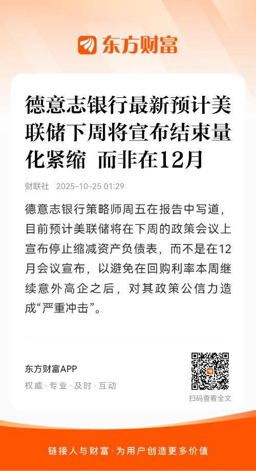 德意志银行策略师周五在报告中写道,目前预计美联储将在下周的政策会议上宣布停止缩减资产负债表,而不是在12月会议宣布,以避免在回购利率本周继续意外高企之后,对其政策公信力造成“严重冲击”。