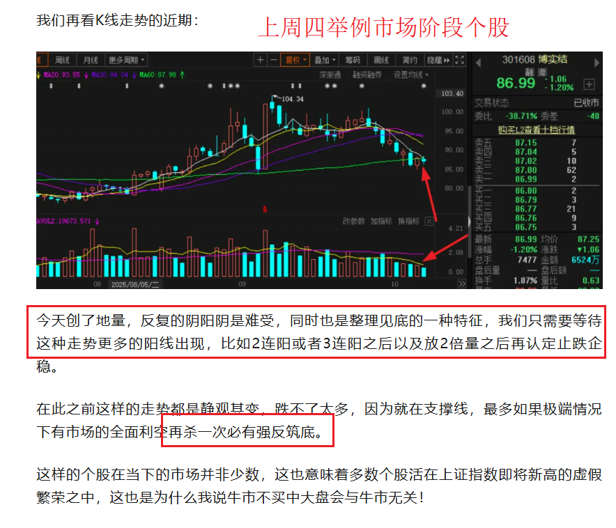 上周四举例个股博实结,告诉大家所在的市场阶段,市场完全按照我写的那样进行,周五强杀见底,周一就开始反弹,然后几根阳线之后今天跳空大涨。