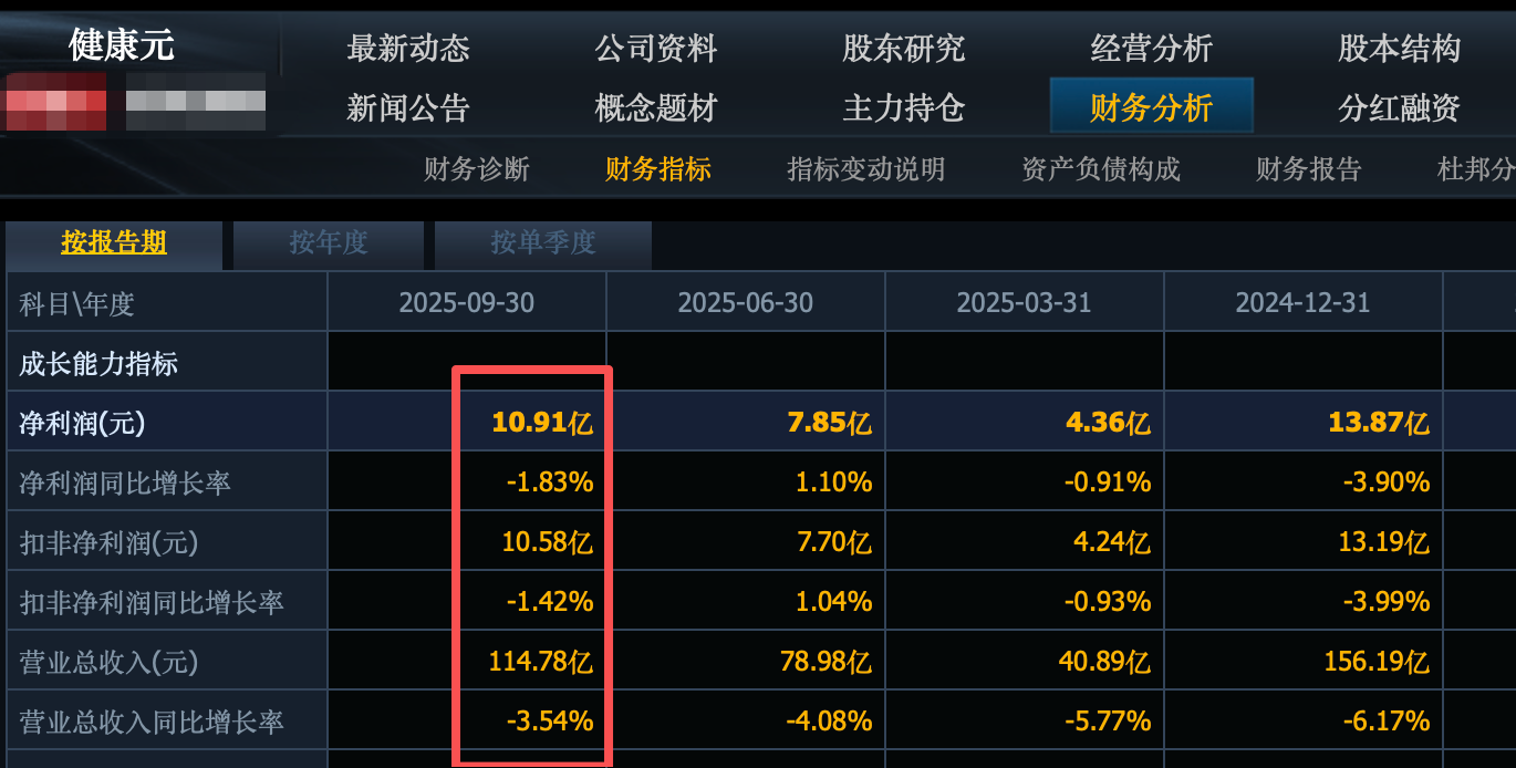 健康元今年前三季度收入下滑3.5%到115亿,净利润下滑1.8%到10.91亿元。