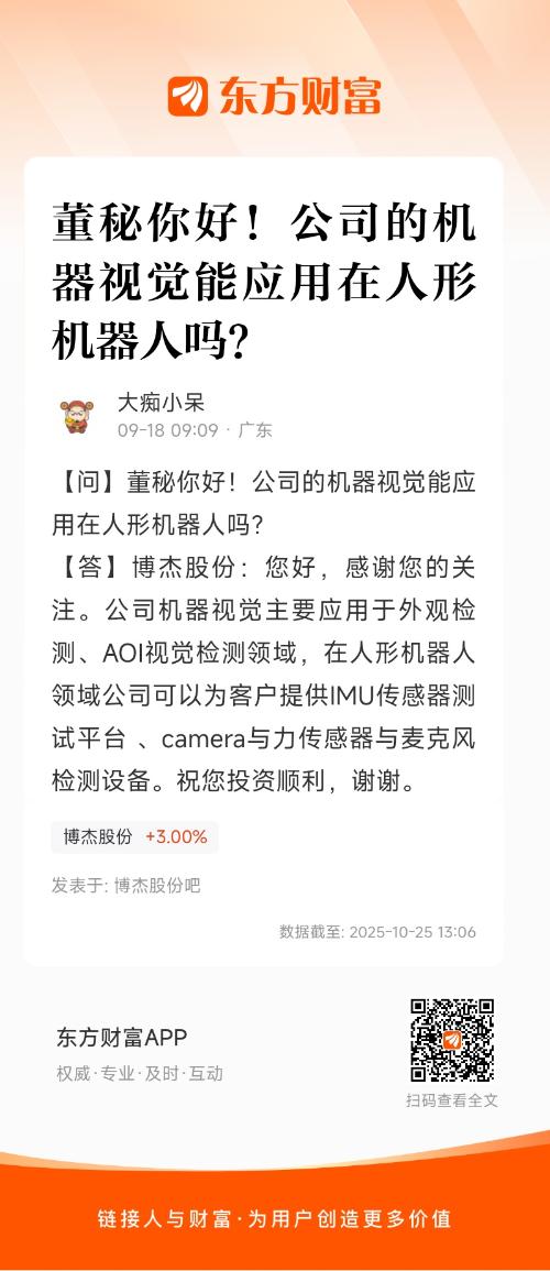 您好,感谢您的关注。公司机器视觉主要应用于外观检测、AOI视觉检测领域,在人形机器人领域公司可以为客户提供IMU传感器测试平台 、camera与力传感器与麦克风检测设备。祝您投资顺利,谢谢。