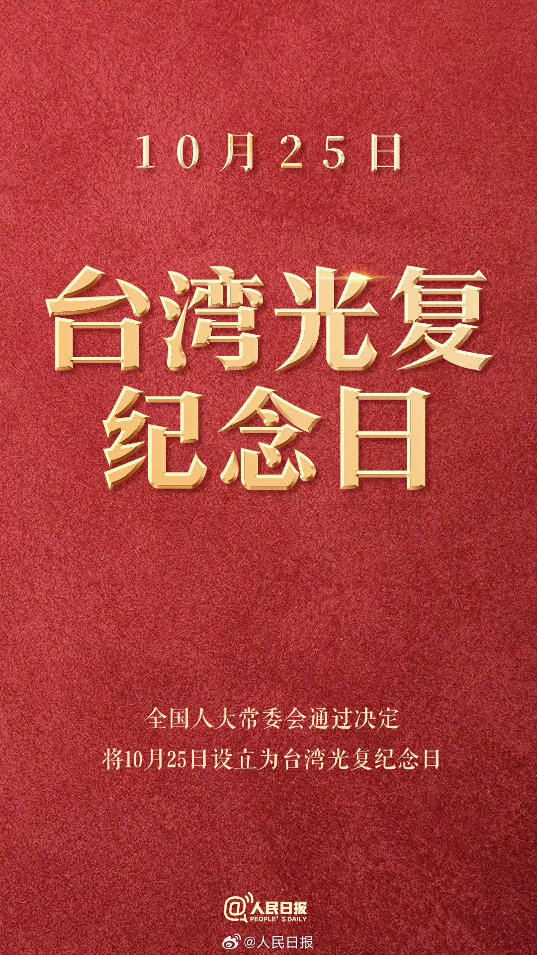 全国人大常委会周五宣布将每年的10月25日设立为“台湾光复纪念日”,今天是设立以
