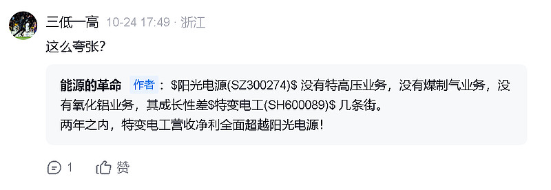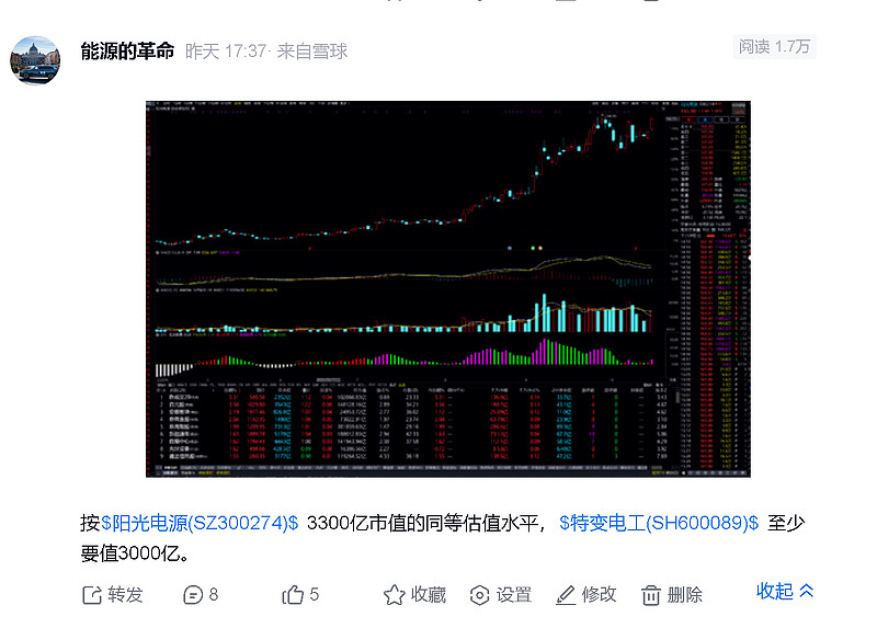 昨天我留言说:按$阳光电源(SZ300274)$ 3300亿市值的同等估值水平,$特变电工(SH600089)$ 至少要值3000亿。