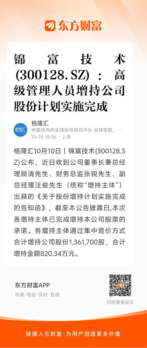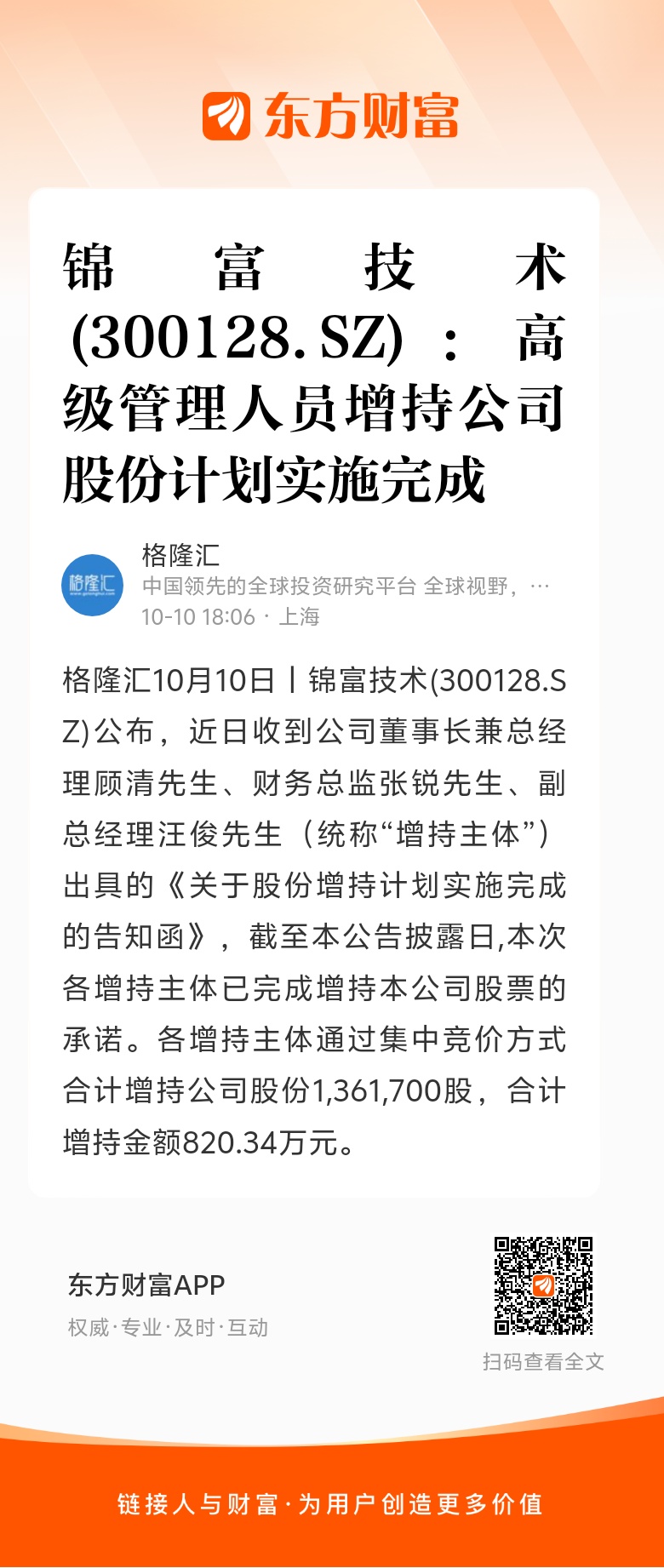 格隆汇10月10日丨锦富技术(300128.SZ)公布,近日收到公司董事长兼总经理顾清先生、财务总监张锐先生、副总经理汪俊先生(统称“增持主体”)出具的《关于股份增持计划实施完成的告知函》,截至本公告披露日,本次各增持主体已完成增持本公司股票的承诺。各增持主体通过集中竞价方式合计增持公司股份1,361,700股,合计增持金额820.34万元。