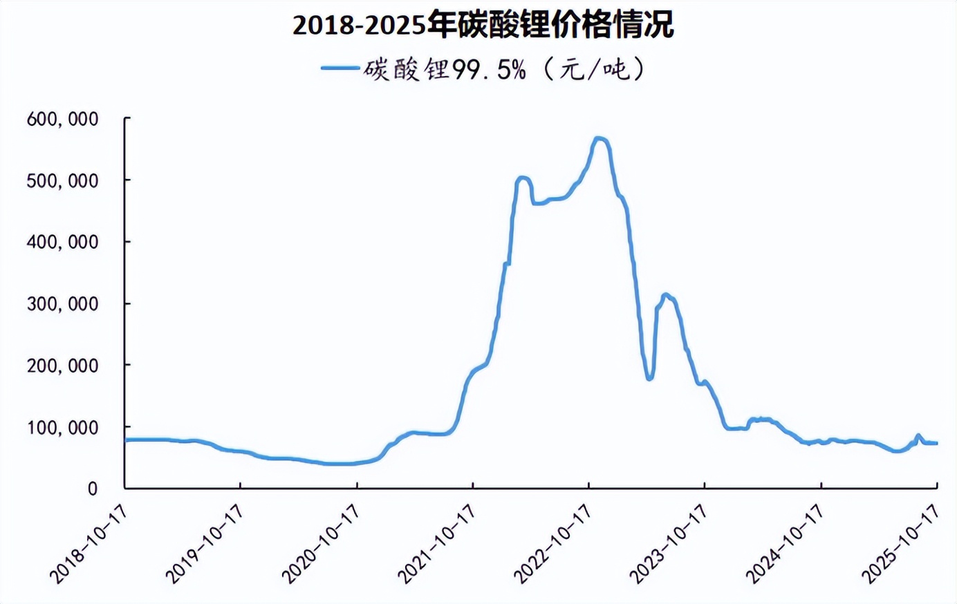 碳酸锂价格于2022年达到顶峰,最高可达60万元/吨。此后,其价格逐渐下探,到2025年9月已降至7万元/吨,降幅达88%。