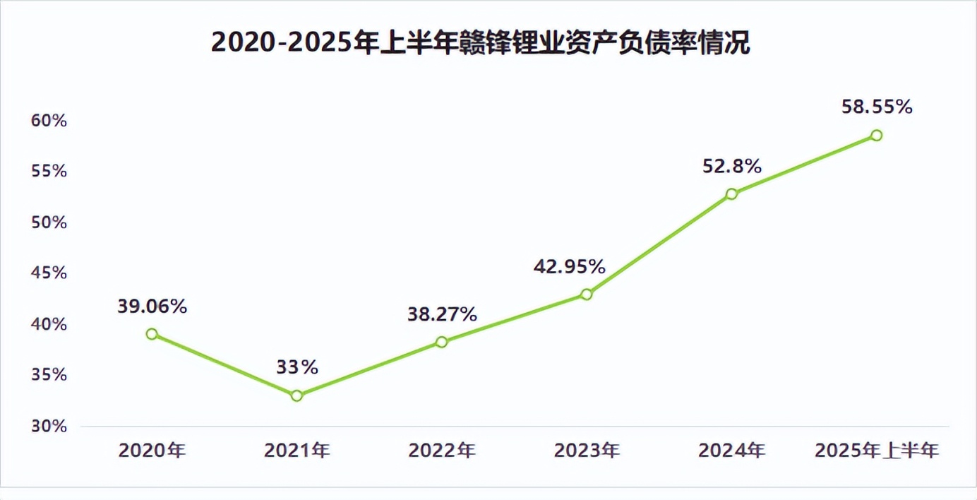 2020年到2025年上半年,赣锋锂业资产负债率从39.06%逐步攀升至58.55%。