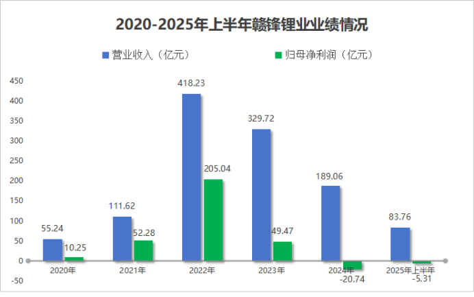 2025年上半年,赣锋锂业实现营收83.76亿元,净利润-5.31亿元,仍未扭亏为盈。