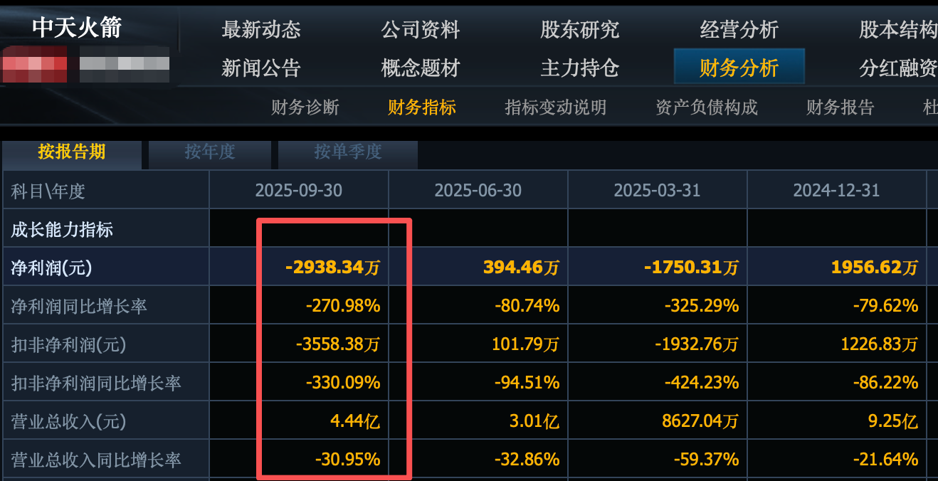 中天火箭收入下滑31%到4.44亿,净利润下滑271%亏损0.3亿。