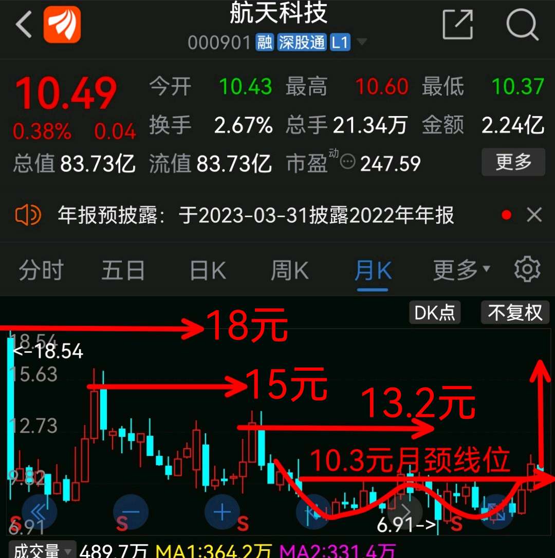 航天科技月形态应该可以看成大双底形态,颈线位10.3元左右