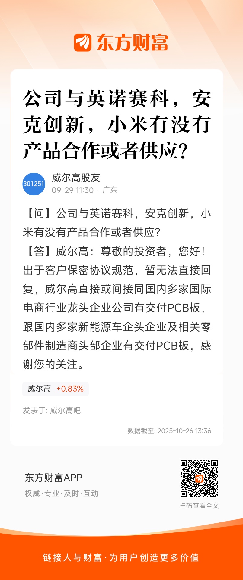 尊敬的投资者,您好!出于客户保密协议规范,暂无法直接回复,威尔高直接或间接同国内多家国际电商行业龙头企业公司有交付PCB板,跟国内多家新能源车企头企业及相关零部件制造商头部企业有交付PCB板,感谢您的关注。