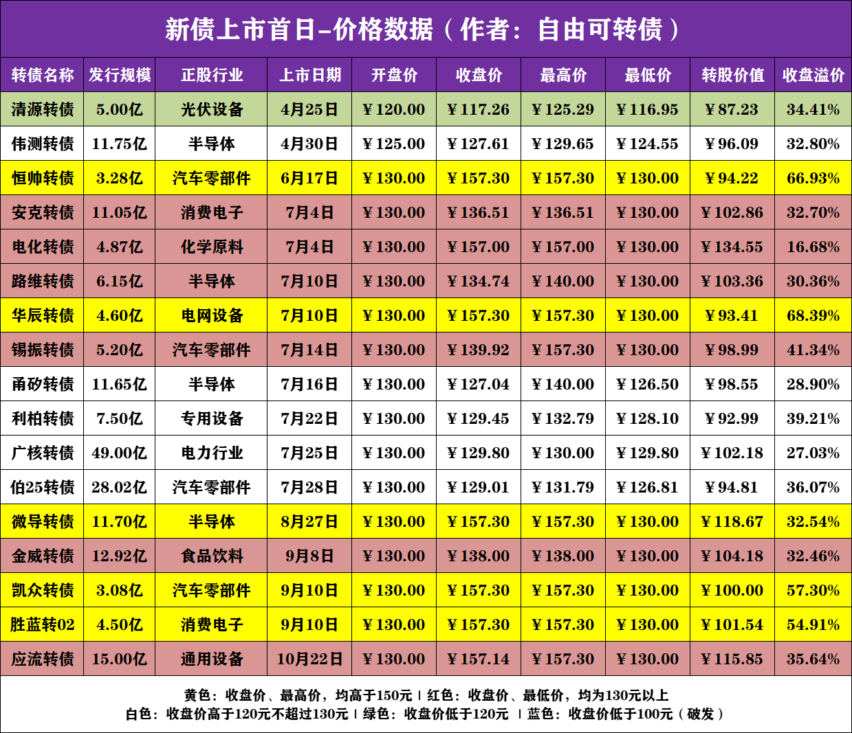 近期上市新债首日价格数据(共17只):达到最高价7只、收盘维持最高价5只、开盘价为130元15只、收盘价130元以上11只。