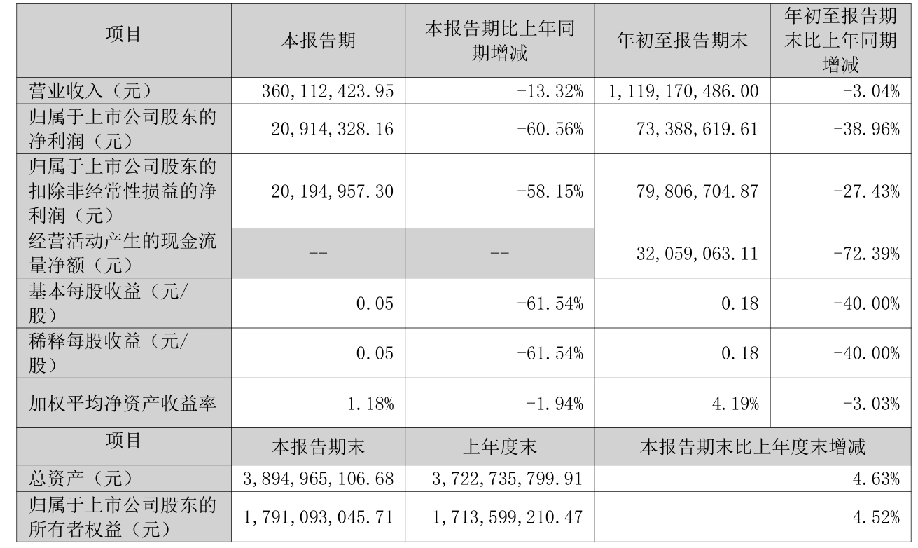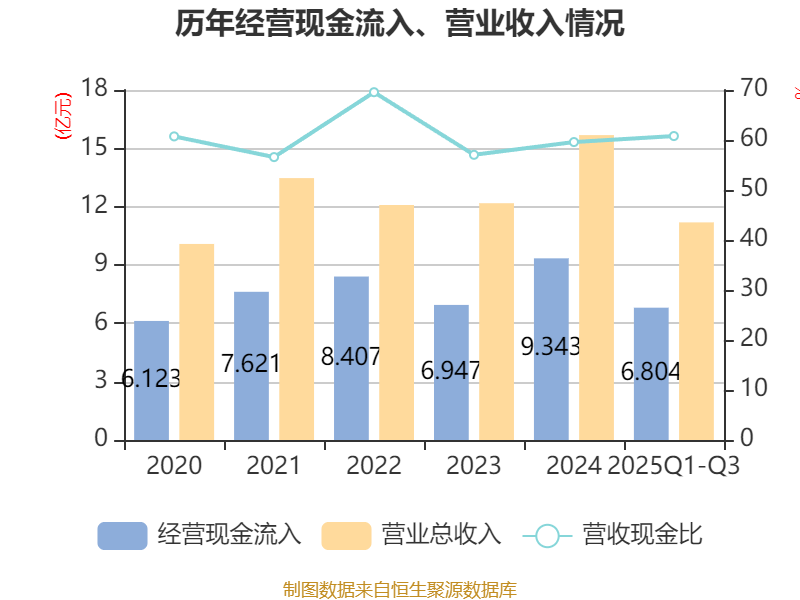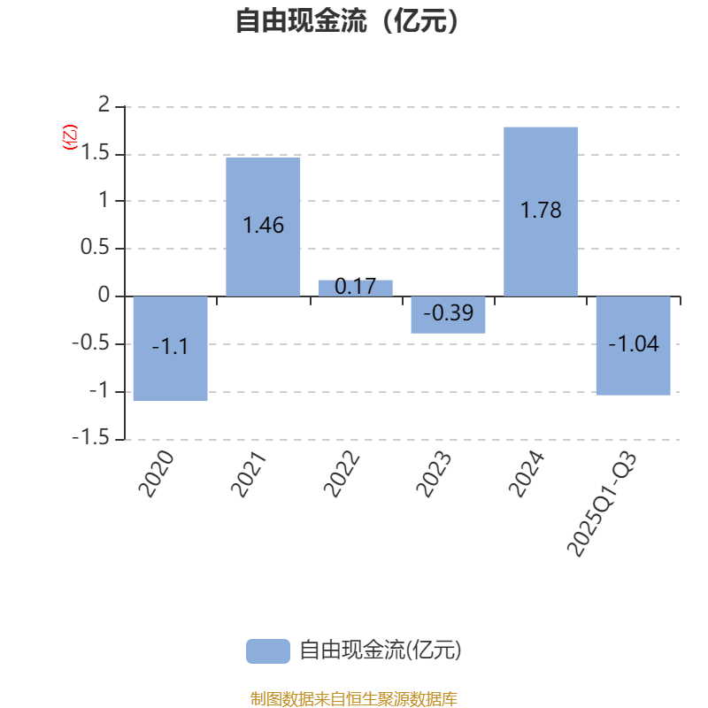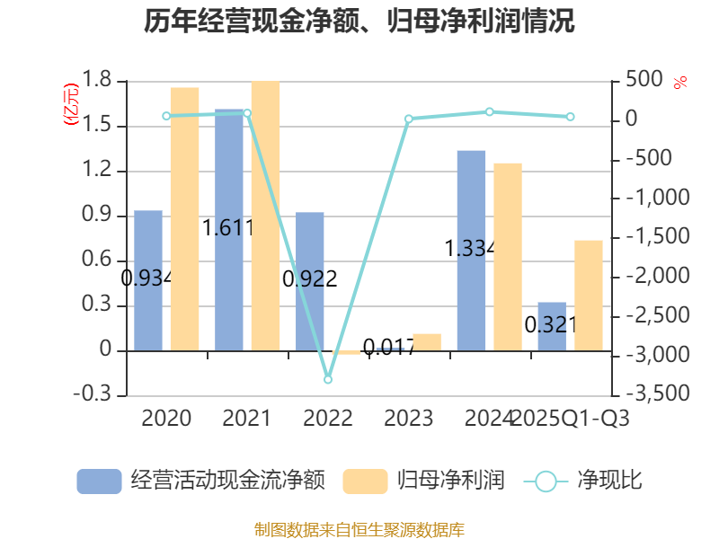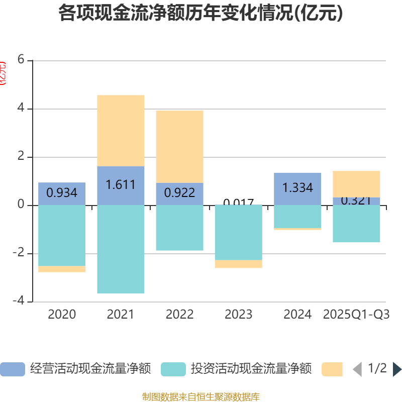 2025年前三季度,公司经营活动现金流净额为3205.91万元,同比下降72.39%;筹资活动现金流净额1.09亿元,同比增加1.7亿元;投资活动现金流净额-1.54亿元,上年同期为-8923.84万元。