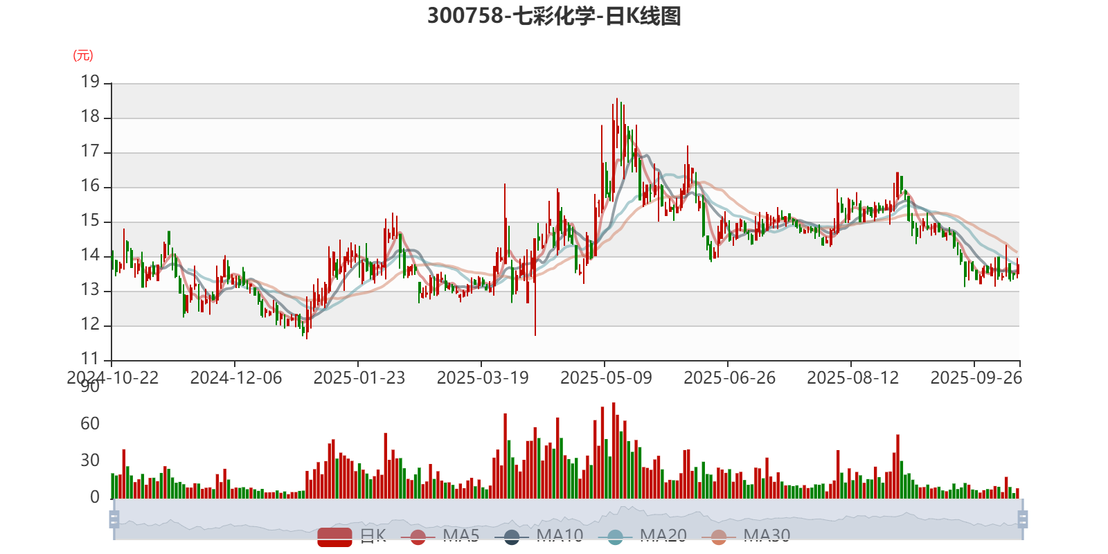 中证智能财讯七彩化学(300758)10月22日披露2025年第三季度报告。前三季度公司实现营业总收入11.19亿元,同比下降3.04%;归母净利润7338.86万元,同比下降38.96%;扣非净利润7980.67万元,同比下降27.43%;经营活动产生的现金流量净额为3205.91万元,同比下降72.39%;报告期内,七彩化学基本每股收益为0.18元,加权平均净资产收益率为4.19%。