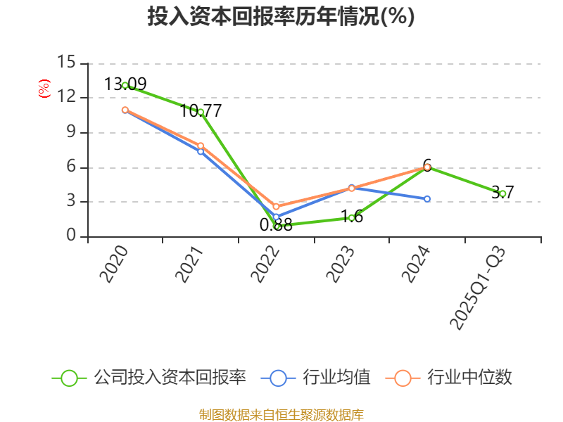 盈利能力方面, 2025年前三季度公司加权平均净资产收益率为4.19%,同比下降3.03个百分点。公司2025年前三季度投入资本回报率为3.7%,较上年同期下降1.88个百分点。